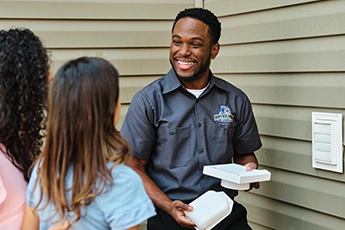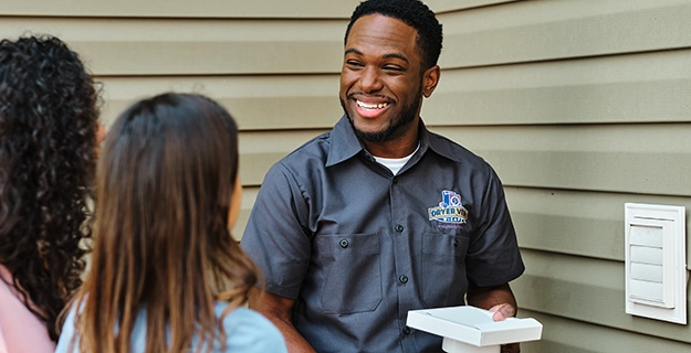 A dryer vent professional replaces the exterior dryer vent cover of a home while speaking to homeowner.